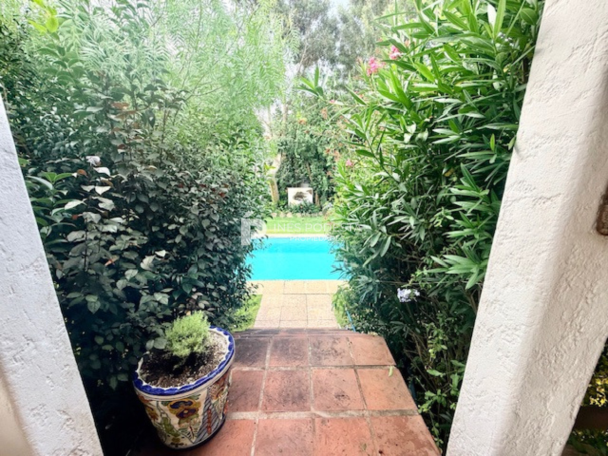 Estupendo lote parquizado, ubicado en la mejor zona de Punta Ballena con orientación oeste. 1600 m2 con 34 metros de frente, rodeado de árboles con más de 40 años, dando no solo intimidad y sombra sino que amortigüando todo tipo de ruido molesto. A tan solo 200 metros de la playa y de una zona náutica para los amantes de este deporte. Sobre la derecha, se desarrolla una casa en una sola planta, estilo griego, de la década del 80, muy bien mantenida con baños hechos a nuevo y con posibilidades de construir más m2 (contamos con proyecto para quien le interese). Cuenta con living comedor, estufa a leña, amplia cocina semi integrada, 3 dormitorios, 2 baños, toilette, pequeño dormitorio ideal para despensa. En el exterior se ubica una terraza que se accede por escalera, garage o cochera, sistema de riego sectorizado, pozo para riego de 60 mts de profundidad con un caudal de 1500 lts hora, piscina climatizada, parrillero techado, pequeño estar exterior para relax y un cómodo lavadero. A destacar: zona protegida de construcciones mayor a 7 metros de altura, hay senderos que conecta la rinconada baja de la alta y está declarado patrimonio nacional, así como también, por detrás se encuentra el Arboreto Lussich con 200 hectáreas, también declarado patrimonio nacional y una de las reservas de flora y fauna más grandes de Uruguay.